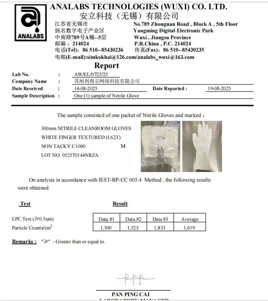 The new Lijie clean 12-inch Class 1000 nitrile gloves (L62T) feature proprietary ‘dual chlorine washing + DI water rinsing’ technology, with over 8 cycles of cleaning using 18 MΩ water. Strict control keeps LPC below 2000—far lower than the Class 1000 limit of 3500—while ensuring ‘fingerprint-free’ performance. This minimizes defects in ultra-precise components like chips and LCD panels, providing reliable protection for high-cleanliness manufacturing.