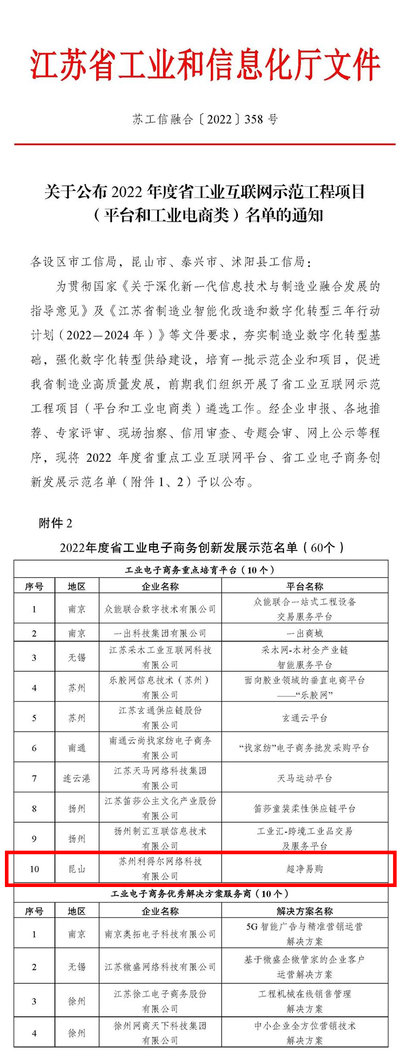 In July 2022, the Department of Industry and Information Technology of Jiangsu Province officially issued the <<Notice on Announcing the 2022 Provincial Industrial Internet Demonstration Project (Platform and Industrial E-Commerce Category) List>>, and the Chaojingyigou Platform was selected as the “2022 Provincial Industrial E-Commerce Innovation and Development Demonstration List – Industrial E-Commerce Key Cultivation Platform”.