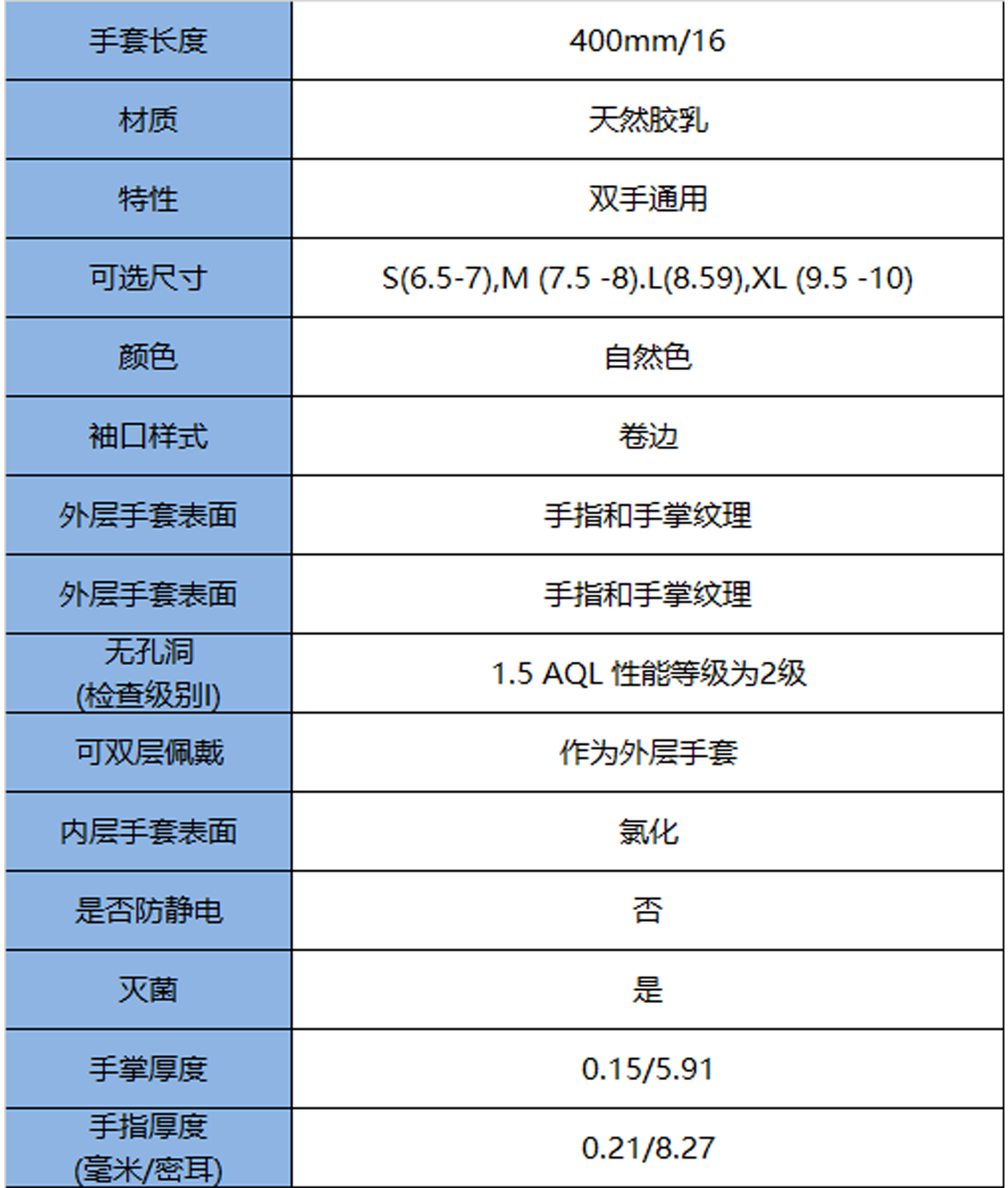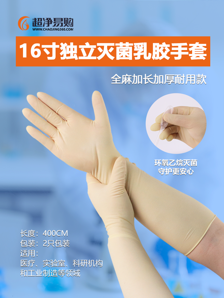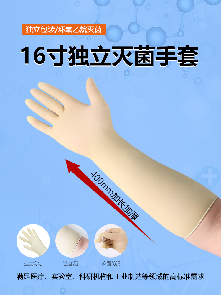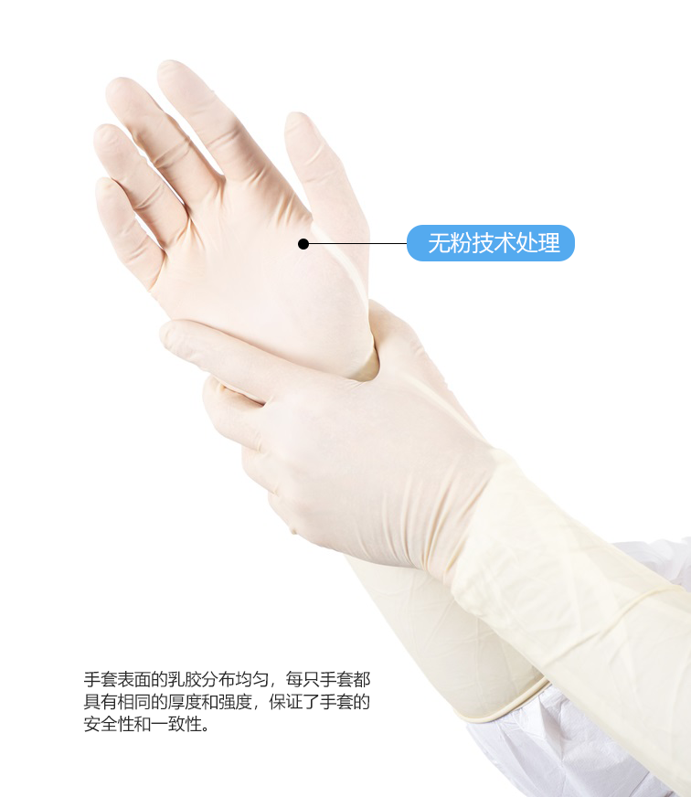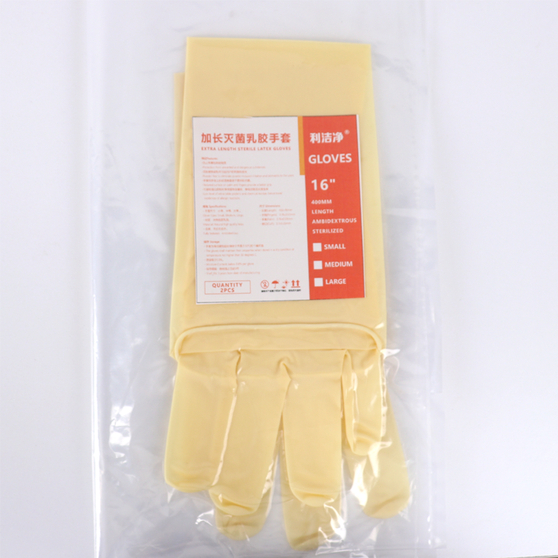 1.-Dust-free design: using advanced powder-free processing technology, the gloves do not contain talcum powder or other dust components on the inner and outer surfaces, reducing the risk of contamination. -Homogeneous rubber content: Made of high quality natural rubber latex with homogeneous rubber content, ensuring the gloves are fine textured, flexible and durable. -Extra-long design: 16-inch length is designed to provide extra protection for wrists and forearms, effectively preventing the intrusion of contaminants. -Sterilization: Sterilized and suitable for operation in high standard environments. -High sensitivity: The gloves are thin and soft, providing good tactility and dexterity for delicate operations. -Comfortable fit: Ergonomically designed to fit the hand shape, still comfortable to wear for a long time. -Strong tear resistance: good tear and puncture resistance, even in high-intensity operation can remain intact.