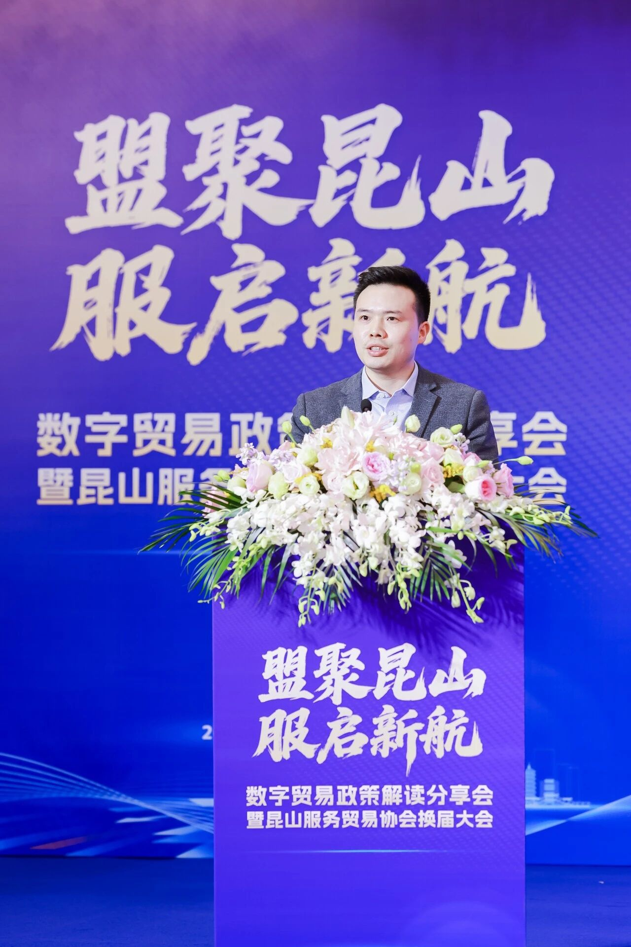 On October 24, the Digital Trade Policy Interpretation Sharing Session and the Leadership Transition Conference of the Kunshan Service Trade Association were successfully held in Kunshan. The event brought together over 150 representatives, including influential figures from the digital trade sector, presidents and secretaries-general of service trade associations across Jiangsu Province, outstanding entrepreneurs, and members of various Kunshan associations such as the Young Entrepreneurs Association, Women Entrepreneurs Association, E-commerce Association, Software and Information Association, and Cross-border E-commerce Association.